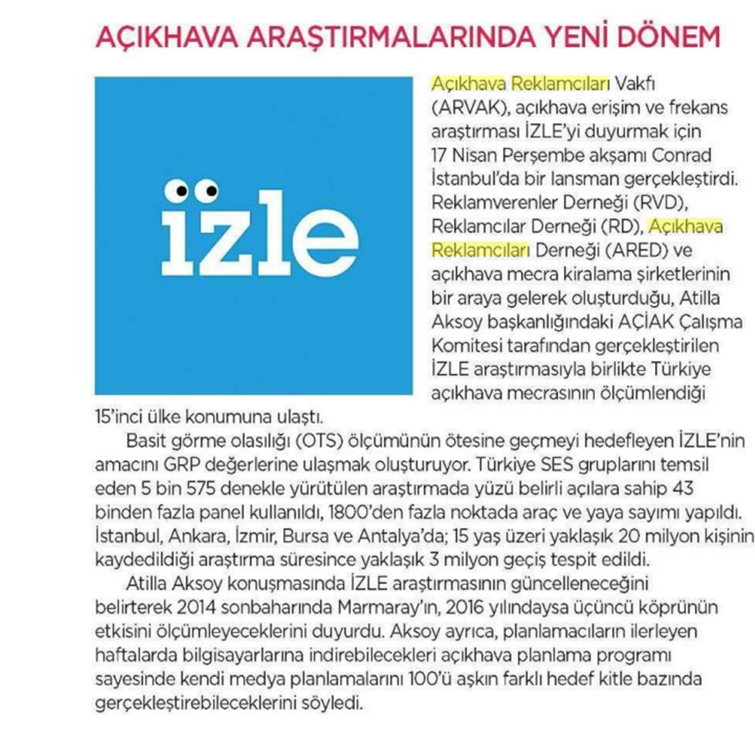 GeriAçıkhava Reklamcıları Vakfı (ARVAK), açıkhava erişim ve frekans araştırması İZLE'yi duyurmak için 17 Nisan Perşembe akşamı Conrad İstanbul'da lansman gerçekleştirdi.